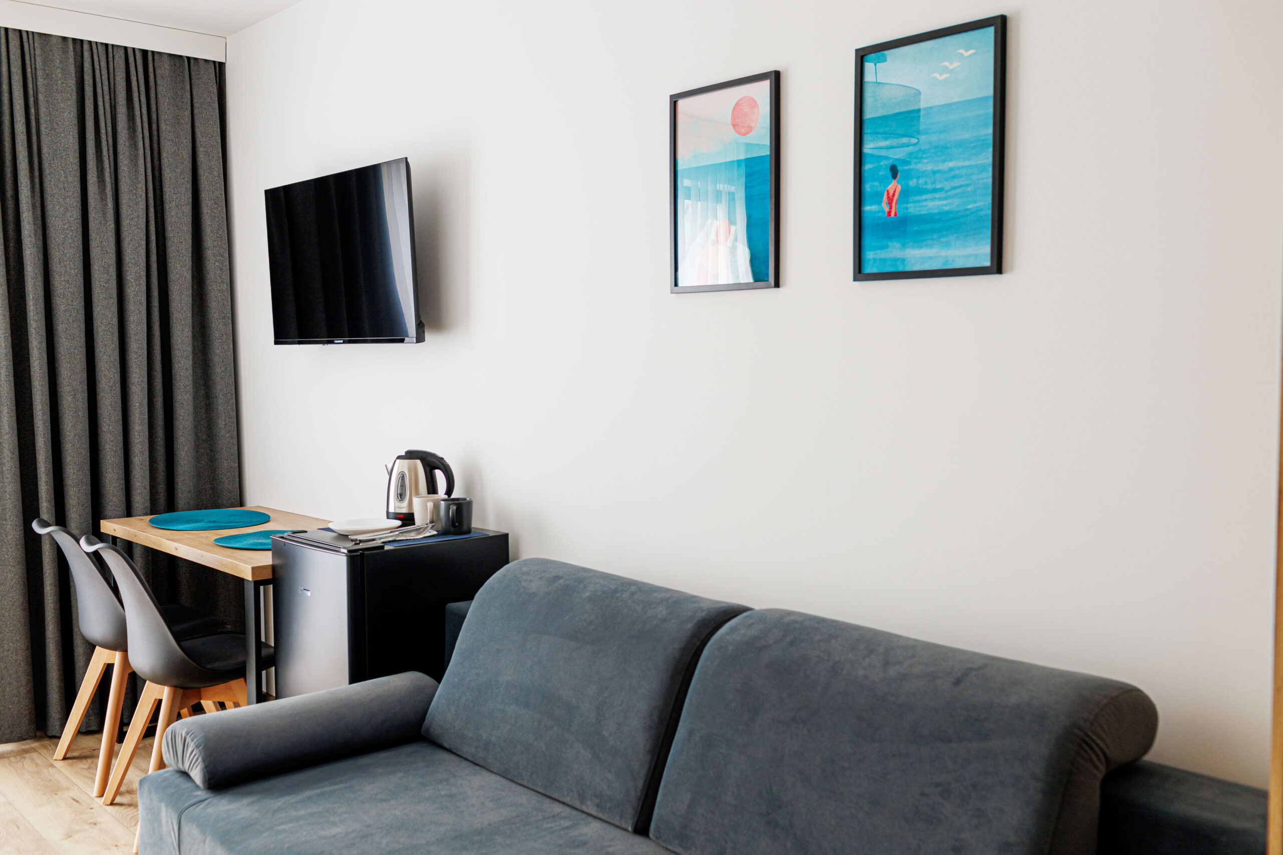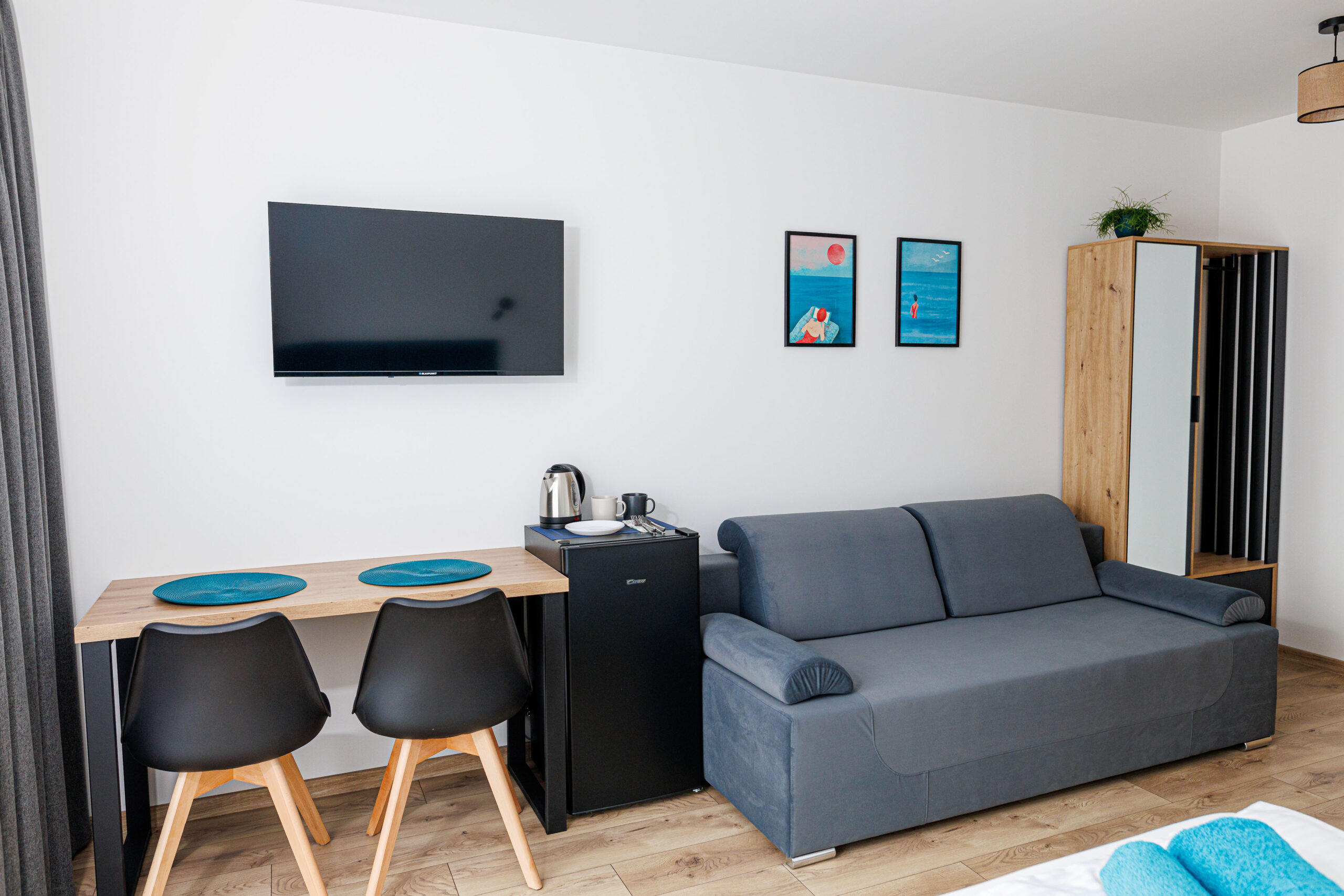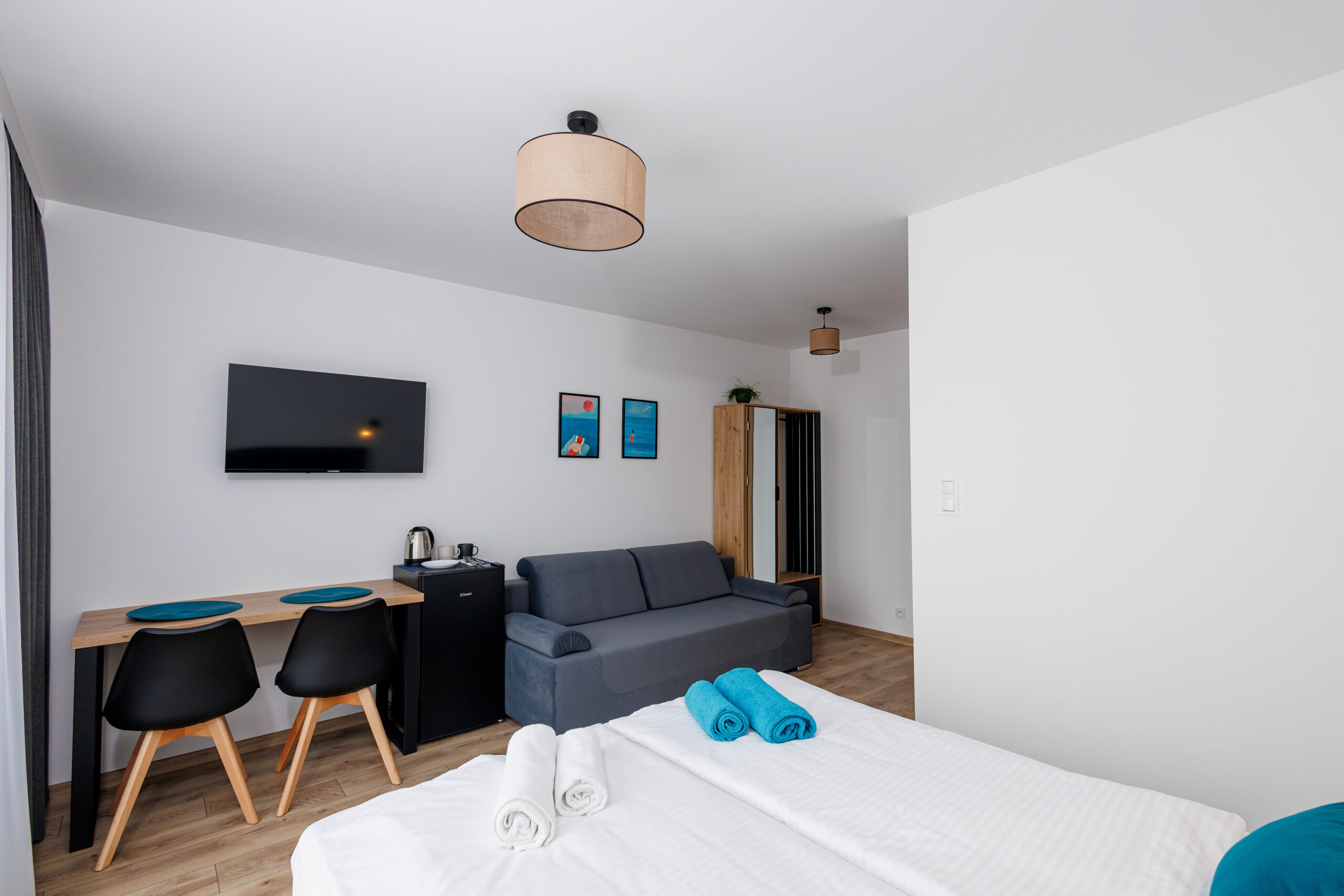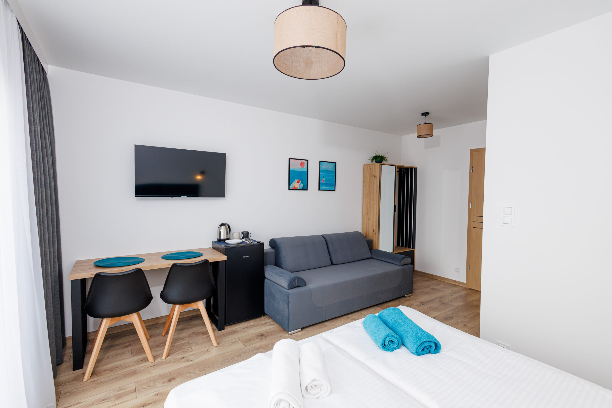 Oferujemy dwupokojowe apartamenty dla 4 osób z aneksem kuchennym, wyposażone w kuchnię, lodówkę, mikrofalówkę, kompletny zestaw naczyń oraz płytę indukcyjną.