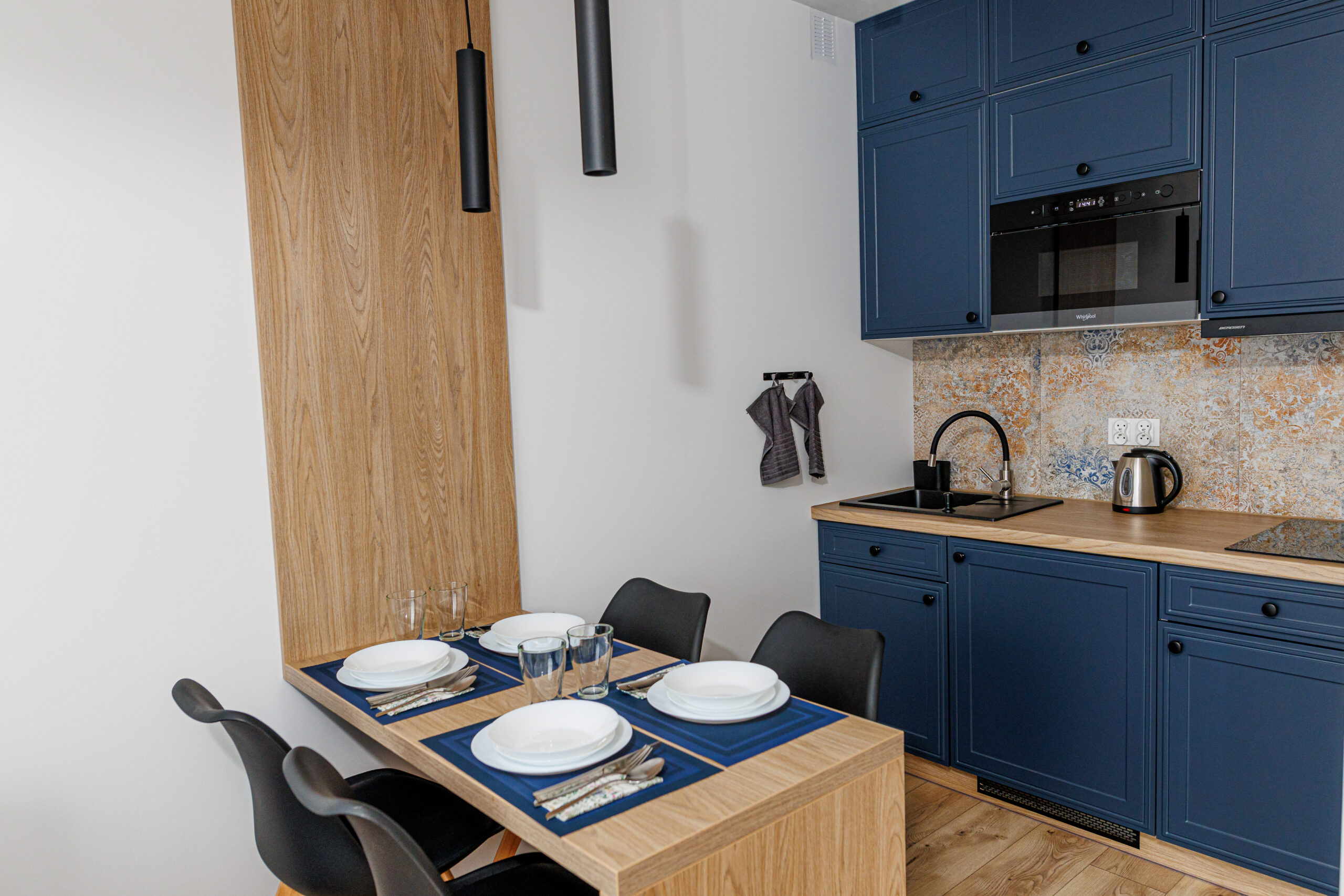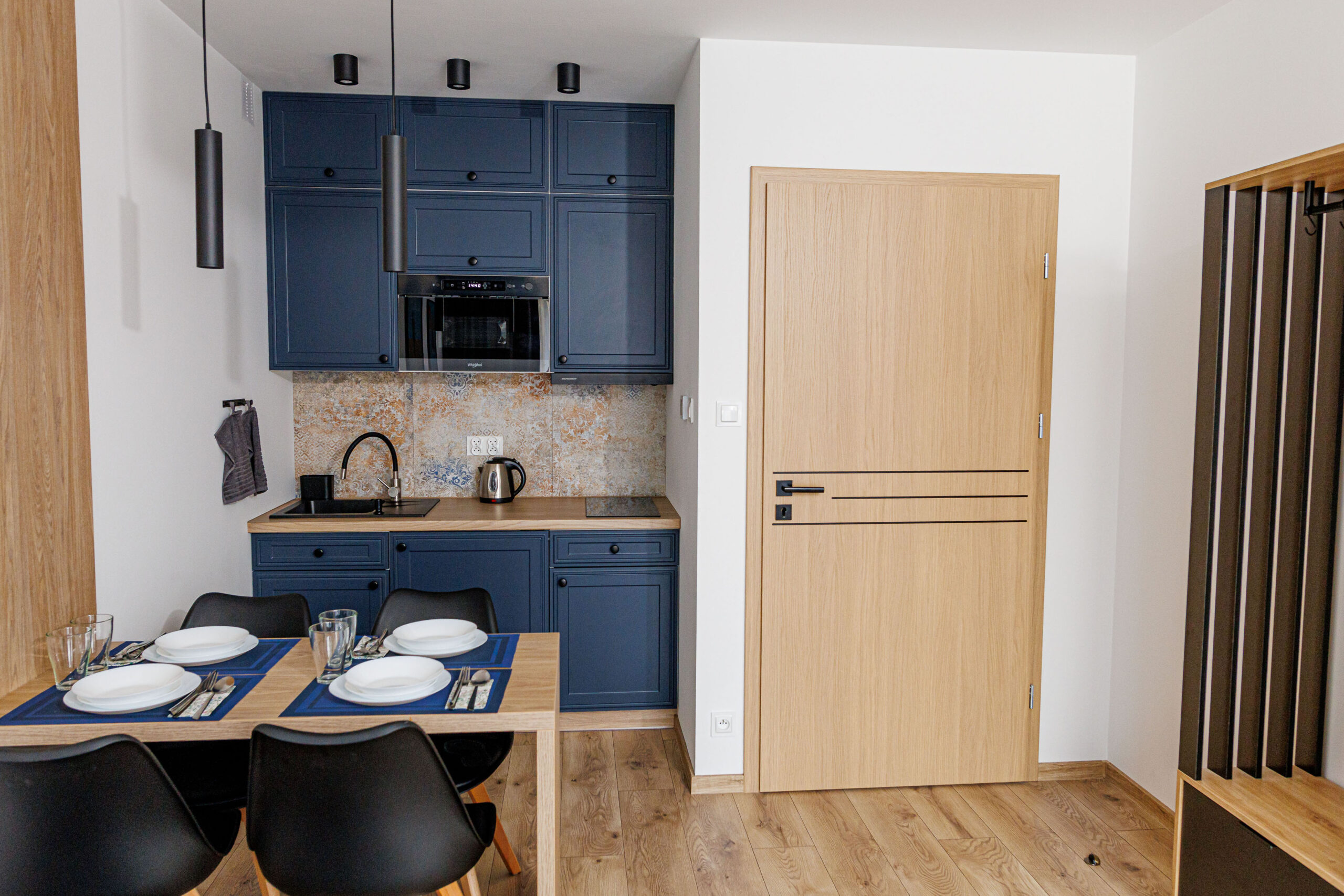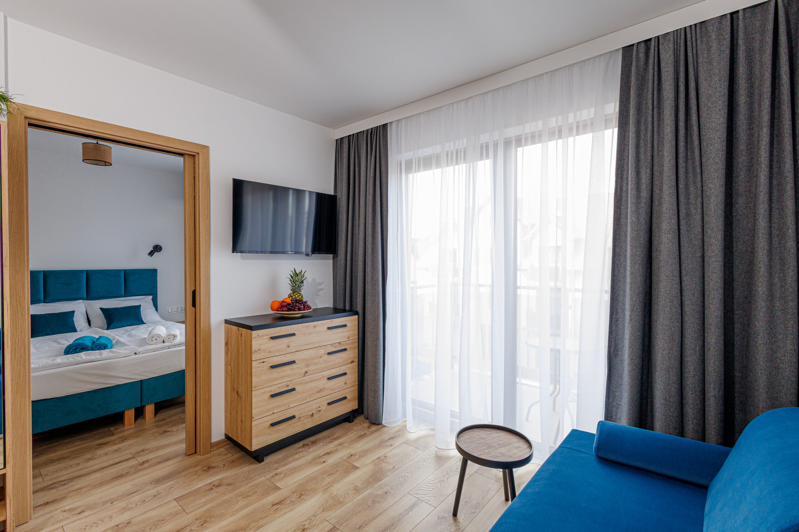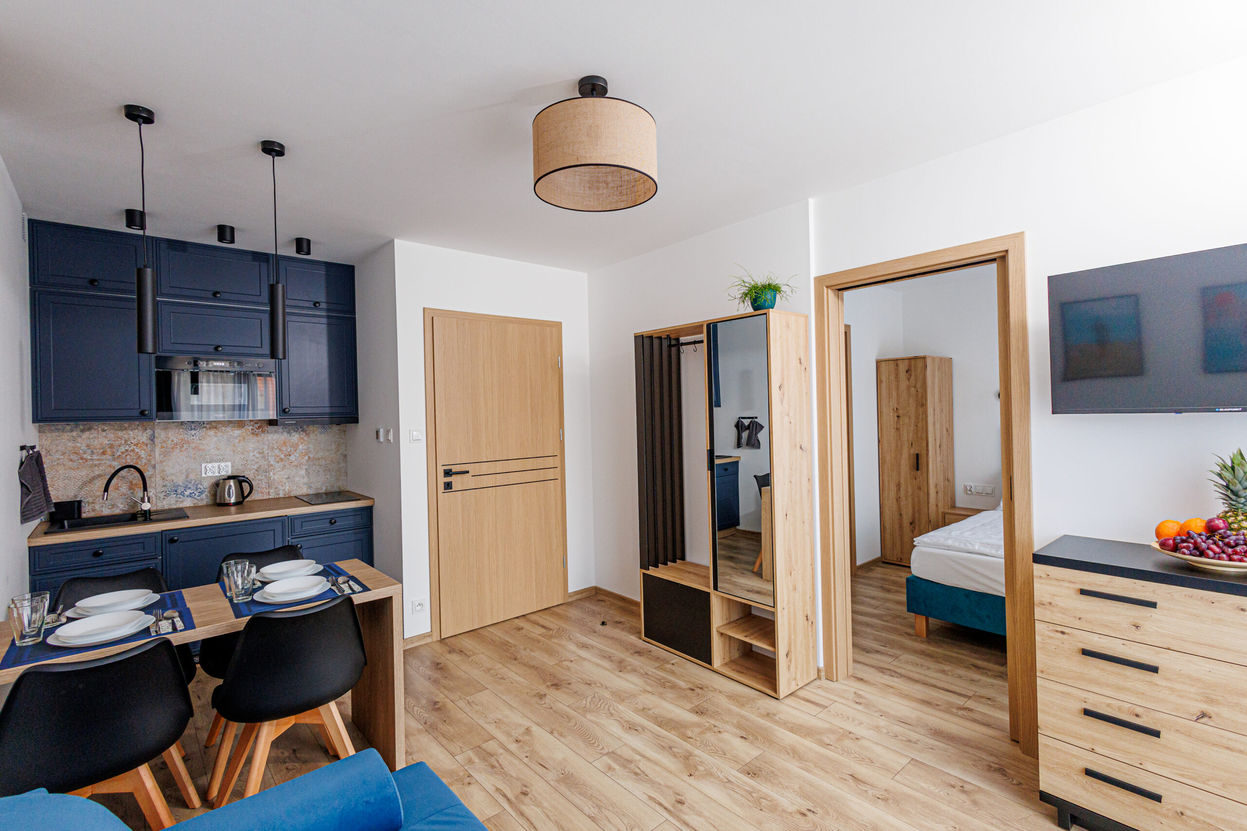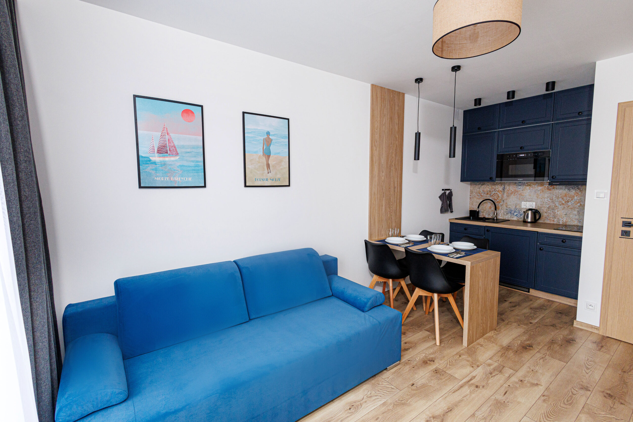 Oferujemy dwupokojowe apartamenty dla 4 osób z aneksem kuchennym, wyposażone w kuchnię, lodówkę, mikrofalówkę, kompletny zestaw naczyń oraz płytę indukcyjną.