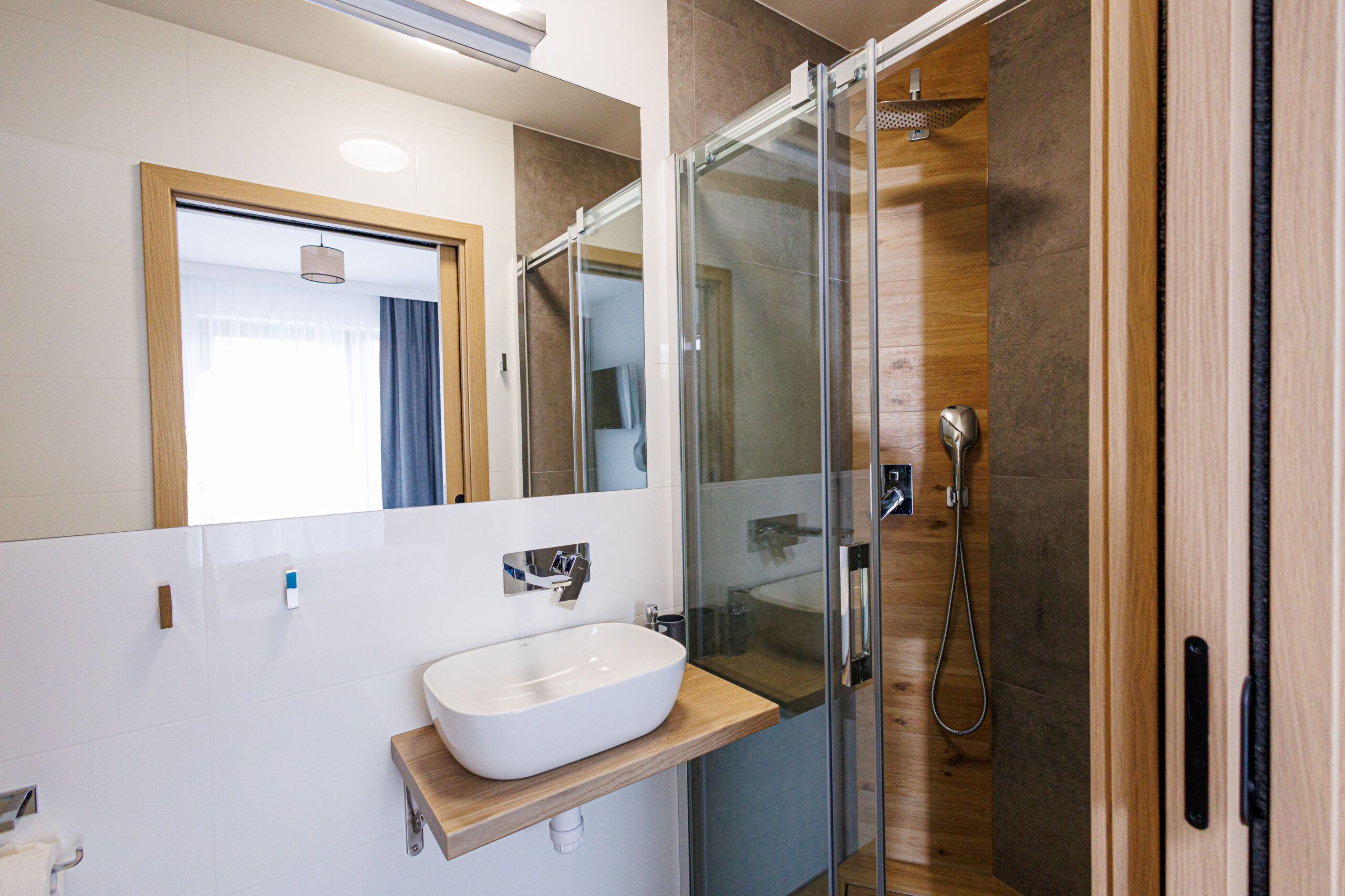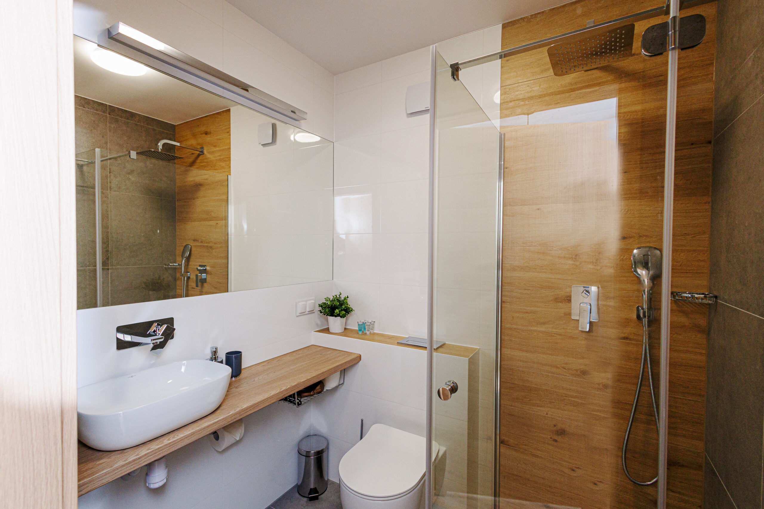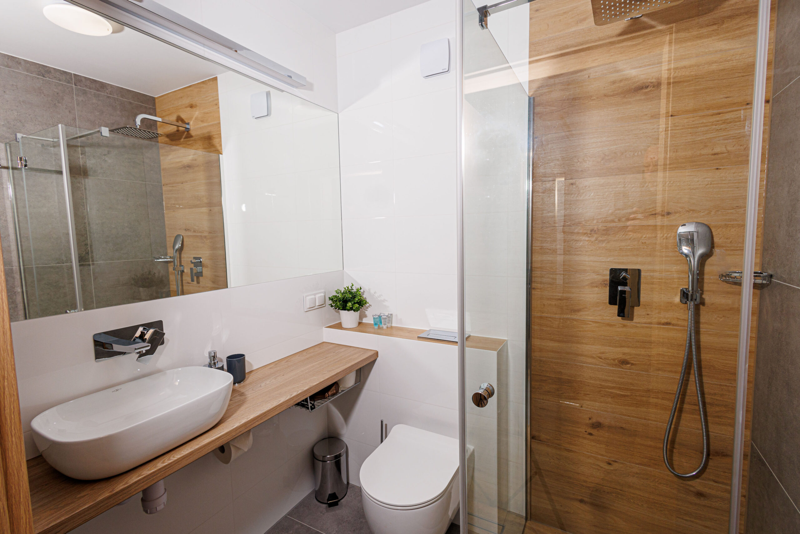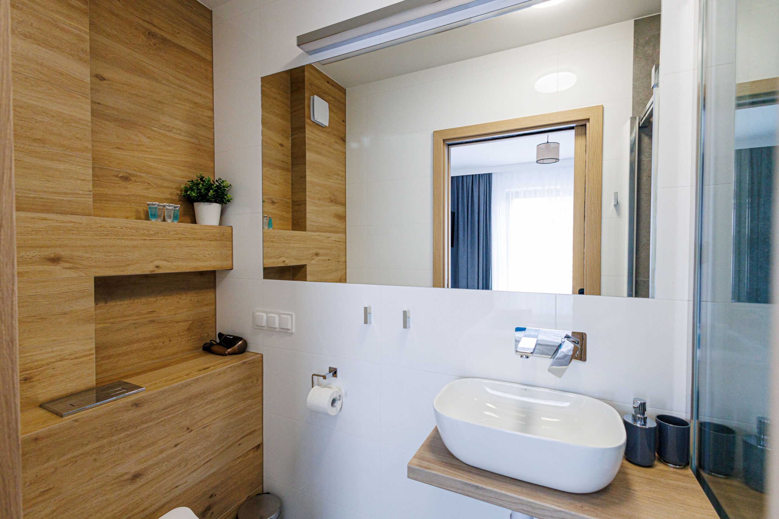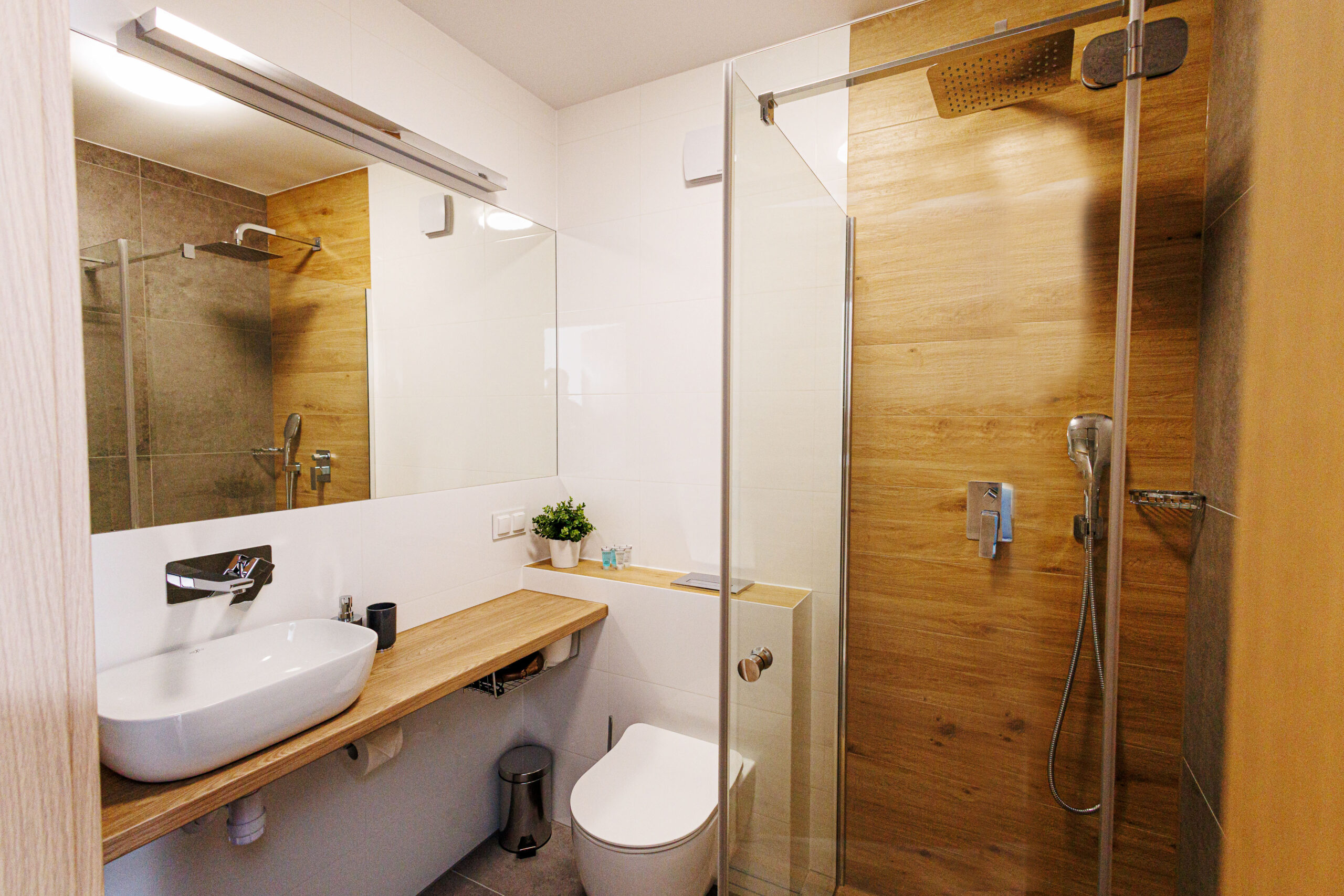 Nasze pokoje są wyposażone w nowoczesne łazienki z prysznicami. Każda łazienka jest zaopatrzona w suszarkę do włosów oraz komplet ręczników.
